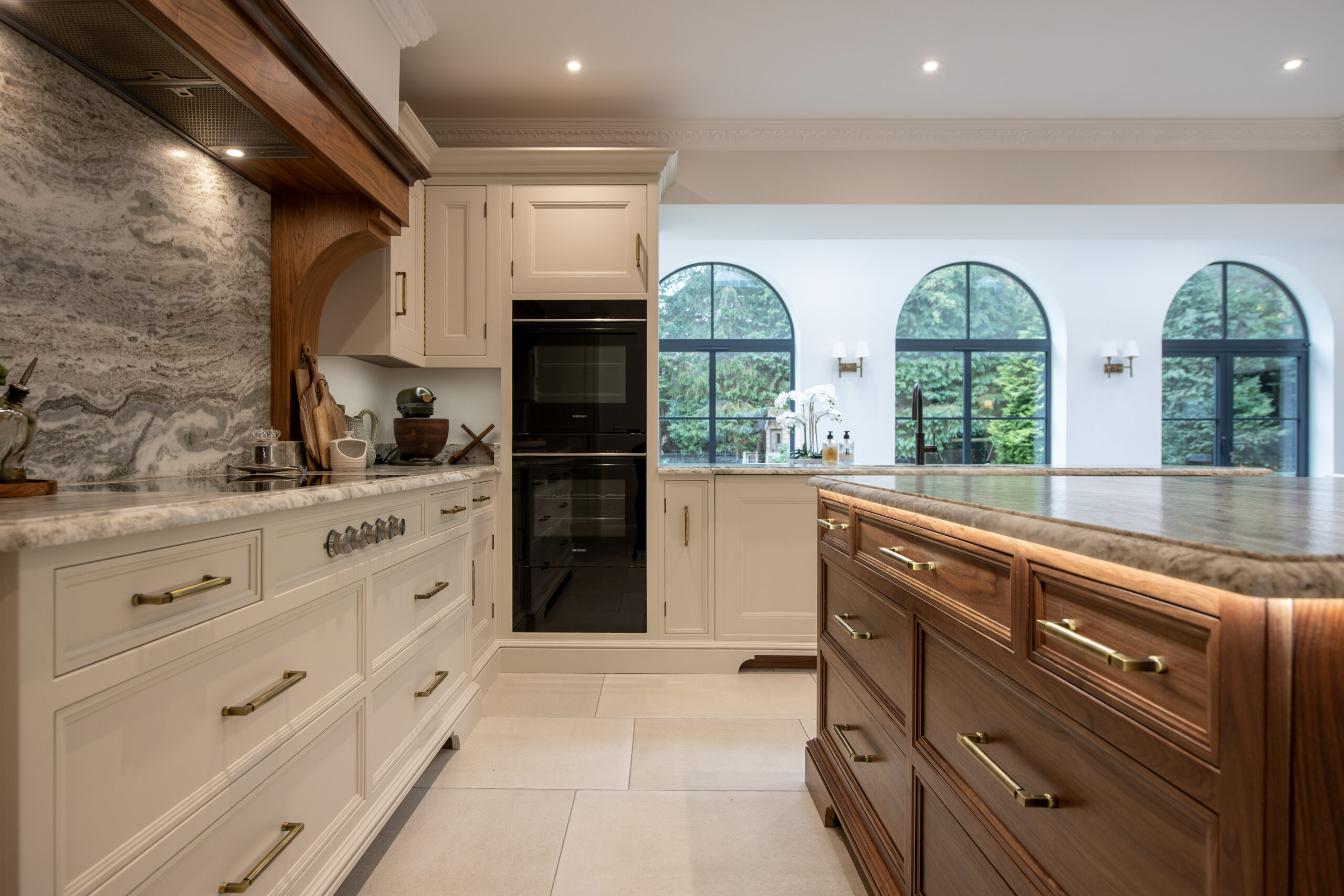A statement cooking zone framed in rich timber detailing creates a striking focal point and celebrates traditional joinery. Across the room, large arched glazed doors and windows pour natural light into the space and open the kitchen directly onto the garden and dining area.