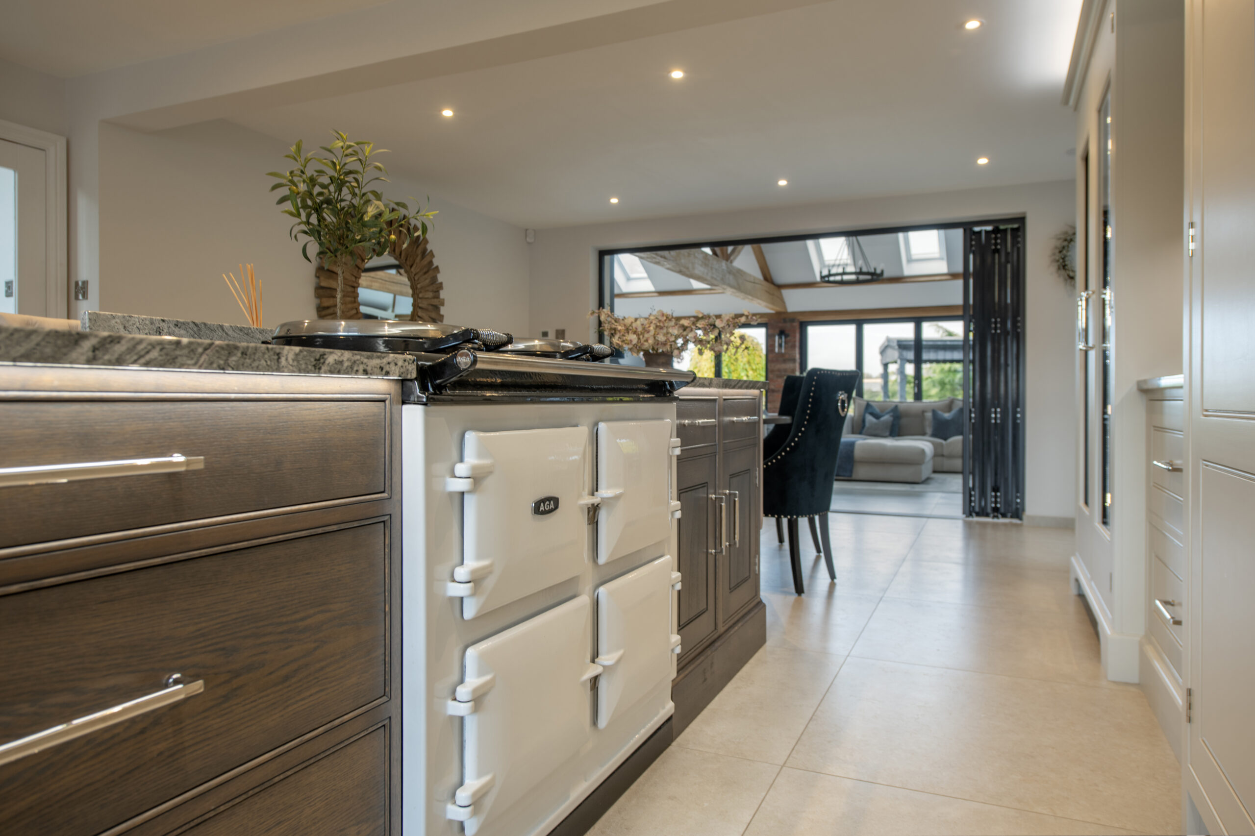 A striking statement island sits at the centre of the space, bringing cooking, gathering, and relaxing together in one cohesive design. It features a classic range cooker, framed in rich grey oak cabinetry and topped with a bold, luxurious worksurface that anchors the room.